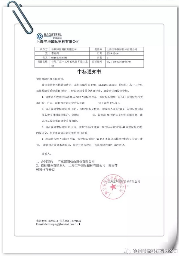 年底收官,销售部捷报来传,滤筒式除尘器生产厂家成功中标广东韶钢松山股份有限公司特扎厂高一工序轧机微雾除尘系统项目。