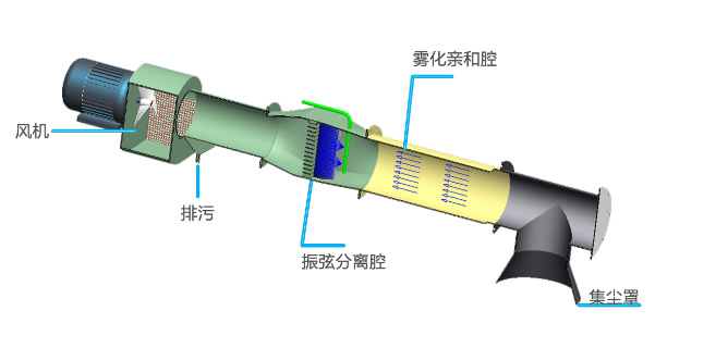 湿式负压诱导除尘器是通过诱导风机建立负压源,将含尘气体卷吸进入雾化亲和腔和振弦分离腔,实现空气与粉尘的分离,达到净化之目的。